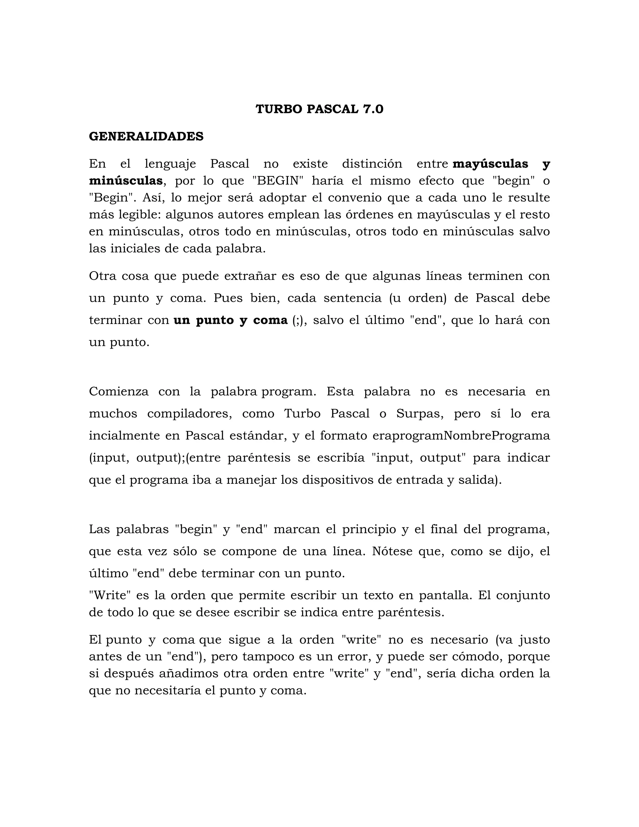 El documento proporciona una introducción al lenguaje de programación Pascal y al entorno de desarrollo Turbo Pascal, describiendo conceptos básicos como las sentencias, variables, tipos de datos, y estructuras de control como condicionales y bucles. Además, incluye varios ejemplos de programas sencillos escritos en Pascal.