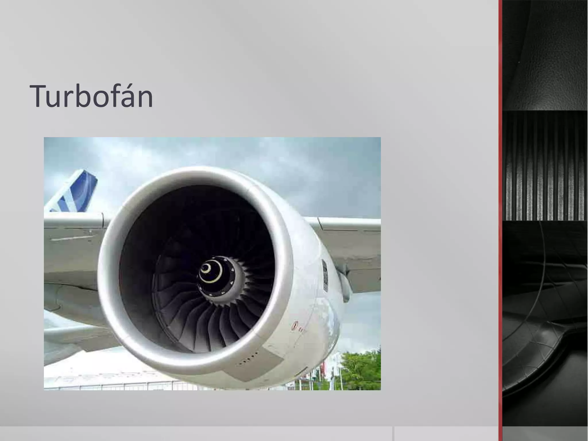 Este documento describe los turbofán, el tipo de motor a reacción que usan la mayoría de aviones comerciales y algunos militares hoy en día. Los turbofán dividen el aire entrante en dos caminos: flujo primario que pasa por el núcleo del motor, y flujo secundario derivado que rodea el núcleo. Esto les da ventajas como menor consumo de combustible y contaminación, y menos ruido, en comparación con los turborreactores. Los clasifica como de bajo o alto índice de derivación dependiendo del porcent