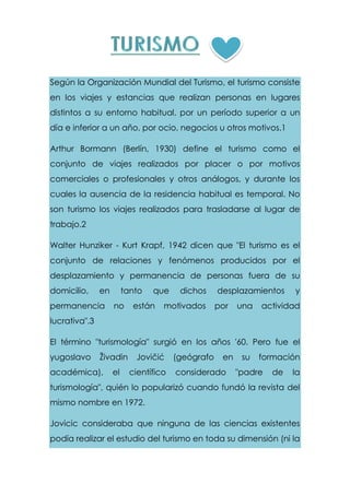 El documento define el turismo como los viajes y estancias que realizan personas fuera de su entorno habitual por motivos de ocio, negocios u otros, por un período de más de un día y menos de un año. Explora la evolución histórica del turismo desde la antigüedad hasta la actualidad, destacando hitos como las peregrinaciones religiosas en la Edad Media, los viajes aristocráticos del Grand Tour en la Edad Moderna y el auge del turismo en el siglo XIX gracias a la revolución industrial y los avances en