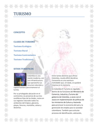 Este documento presenta una breve introducción al turismo en Colombia. Describe las principales clases de turismo como ecológico, rural, gastronómico y tradicional. También menciona algunos de los destinos turísticos más populares en el país y cómo el gobierno regula la industria turística a través del Ministerio de Comercio, Industria y Turismo. Finalmente, ofrece algunas recomendaciones sobre el turismo colombiano.