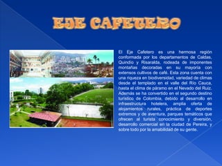 El Eje Cafetero en Colombia, compuesto por los departamentos de Caldas, Quindío y Risaralda, es una región rica en biodiversidad y paisajes montañosos decorados con cultivos de café, convirtiéndose en el segundo destino turístico del país. La isla de San Andrés, a 700 km de la costa continental, ofrece playas, deportes acuáticos y buceo en un paraíso con influencias culturales inglesas y españolas. La capital Bogotá cuenta con una variada vida nocturna, m