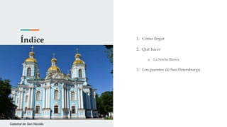 Este documento proporciona información sobre la ciudad de San Petersburgo en Rusia. Ofrece detalles sobre cómo llegar a la ciudad en coche o avión, así como las principales atracciones turísticas como el Palacio de Invierno, la Noche Blanca cuando el sol no se pone, y los numerosos puentes históricos que conectan las islas sobre las que se asienta la ciudad.