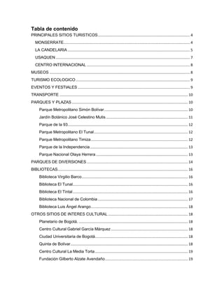 Este documento presenta un resumen de los principales sitios turísticos de Bogotá, Colombia. Describe lugares como Monserrate, La Candelaria, Usaquén, el Centro Internacional, varios museos, parques como el Simón Bolívar y El Tunal, bibliotecas como la Virgilio Barco y la Nacional de Colombia, centros comerciales, vida nocturna y turismo religioso. El documento también menciona el transporte, eventos, turismo ecológico y otros lugares de interés cultural en Bogotá.