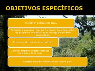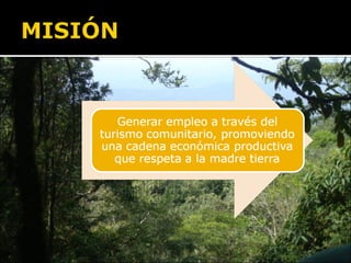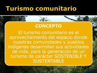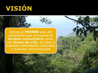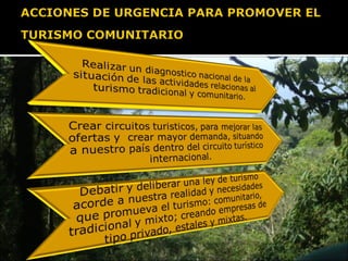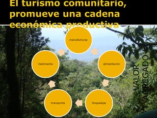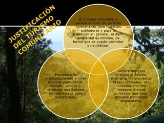 El documento compara el turismo comunitario con la economía tradicional e histórica, señalando que el turismo comunitario genera riqueza mediante el valor agregado, promueve el capital social e inicia un proceso de industrialización, mientras que la economía tradicional solo trajo pobreza. Además, el turismo comunitario proporciona ingresos directos al Estado a través de impuestos, tasas y patentes en los niveles nacional, departamental, municipal e indígena originario campesino.