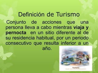 El documento proporciona información sobre el turismo en Panamá. Define turismo y brinda un breve resumen de su historia. Luego clasifica los tipos de turismo y describe los principales recursos y atractivos turísticos de Panamá, incluidas las playas, destinos de lujo y ecoturismo. Explica la creación del IPAT y la ATP para promover el turismo, así como el Plan Maestro de Turismo Sostenible 2007-2020, que tiene como objetivo posicionar al turismo como una herramienta de desarrollo sostenible.