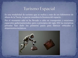 El turismo espacial es un tipo de turismo reciente que involucra viajes al espacio de civiles. Actualmente existen varios tipos de viajes espaciales turísticos, como vuelos suborbitales de corta duración y estadías más largas en la Estación Espacial Internacional. Empresas privadas como Virgin Galactic buscan desarrollar tecnología reutilizable para hacer estos viajes más accesibles y masivos.