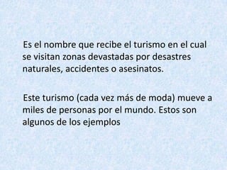 Este documento describe el turismo negro, que involucra visitar áreas devastadas por desastres o tragedias como Chernóbil y Auschwitz. Estos sitios atraen a miles de turistas cada año que son guiados por expertos a través de las zonas afectadas, a pesar de las críticas de que se aprovechan del dolor de otros para ganancias o entretenimiento.