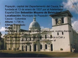 Popayán, capital del departamento del Cauca en Colombia, fue fundada en 1537 y está situada a 1736 metros sobre el nivel del mar con un clima templado. La ciudad cuenta con numerosos museos, iglesias coloniales y sitios de interés cultural como el Museo Arquidiocesano, el Museo de Historia Natural de la Universidad del Cauca, y el Museo Negret dedicado al artista Edgar Negret. Los parques naturales cercanos a Popayán incluyen el Parque Nacional Natural Puracé, el Parque Nacional Natural Munchique y la Isla