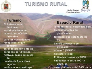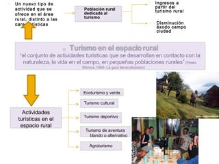 El documento habla sobre el turismo rural. Explica que el turismo es un fenómeno social con impacto económico positivo que implica el desplazamiento temporal de personas hacia otros lugares. Describe el espacio rural como áreas fuera de los límites urbanos donde se ofrecen nuevas actividades turísticas como ecoturismo, turismo cultural y deportivo y agroturismo. Finalmente, señala que estos elementos dan origen a un sistema de turismo rural que involucra factores físicos y humanos y genera beneficios económicos e ingresos