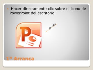 El documento describe los conceptos básicos para crear presentaciones en PowerPoint, iniciando desde la apertura del programa hasta la creación de diapositivas. Incluye información sobre las diferentes barras y herramientas disponibles, así como sobre cómo insertar imágenes y sonidos. También se detalla el proceso para guardar la presentación finalizada.
