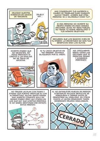 El documento ofrece consejos sobre la avaricia, la inversión y los objetivos financieros. Resalta que la gente busca con el dinero posición social, admiración y posesiones más que solo dinero en sí. Aconseja identificar qué se intenta suplir realmente con el dinero y establecer metas financieras para conseguir tranquilidad y tiempo libre.
