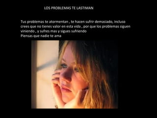 El documento habla sobre alguien que sufre mucho debido a problemas constantes y soledad. La persona se siente sin valor y culpa a otros por sus problemas, y ya no quiere vivir. El texto sugiere que solo Dios puede ayudar a la persona a cambiar su llanto en alegría y hacerla feliz de nuevo. Insta a la persona a buscar a Dios en la página de un sacerdote, donde encontrarán canciones celestiales que les permitirán conocer a Dios y ver cómo cambia su vida.