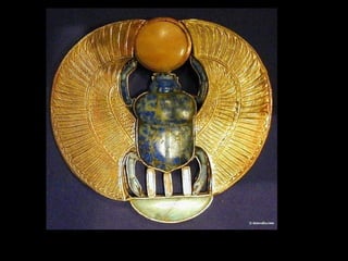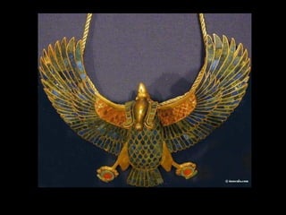 Tutankhamon fue un faraón egipcio que reinó desde los 9 hasta los 18 años. Fue enterrado en el Valle de los Reyes en Tebas, y su tumba fue descubierta en 1922 por Howard Carter. La tumba contenía más de 5,000 objetos maravillosamente preservados debido a que fue una de las pocas tumbas intactas jamás descubiertas. Los objetos incluían ataudes anidados, una máscara mortuoria de oro, carros, tronos y estatuillas que ofrecen una visión única de la