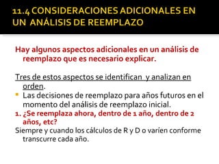 El documento describe un análisis de reemplazo realizado por Claudia para decidir entre conservar el sistema de diagnóstico actual por 3 años más o reemplazarlo ahora con un nuevo sistema. Presenta los costos de ambas opciones a lo largo de un período de 10 años bajo una tasa de interés del 10%. Calcula los valores actuales netos de cada alternativa y compara las opciones para seleccionar la mejor decisión de reemplazo.