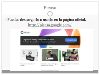 Este documento proporciona un tutorial básico sobre cómo usar el programa Picasa. Explica que Picasa se puede descargar o usar en línea, e importará automáticamente las fotos del ordenador cuando se instale. Una vez instalado, permite seleccionar fotos individuales para editarlas usando herramientas como efectos, y también crear presentaciones, collages y videos con las fotos. En general, Picasa es un programa sencillo para editar y retocar fotografías.