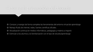 Este documento describe los roles y responsabilidades de un tutor en el proceso de enseñanza-aprendizaje en línea. Un tutor debe dominar las herramientas de aprendizaje virtual, comunicarse continuamente con los estudiantes de manera síncrona y asíncrona, y guiar el aprendizaje individual y colaborativo de los estudiantes a través de estrategias de motivación. Además, un tutor debe contribuir con material didáctico, evaluar el progreso de los estudiantes, y organizar y modular los contenidos para facilitar que los estudiant