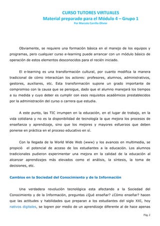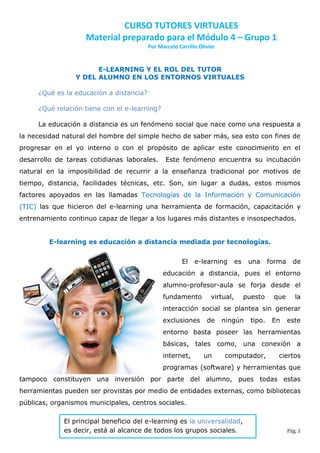 Este documento describe el e-learning y el rol del tutor y el alumno en entornos virtuales. Explica que el e-learning es una forma de educación a distancia mediada por tecnología que permite la interacción social sin exclusión. También discute cómo las conexiones entre el tutor, alumnos y tareas formativas son importantes para crear un espacio de pertenencia en el aula virtual y cómo los tutores deben facilitar la interacción para formar una comunidad virtual.