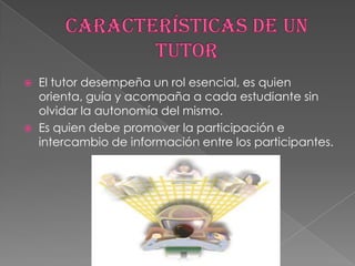 El tutor desempeña un rol esencial guiando y orientando a los estudiantes mientras respeta su autonomía. El tutor establece las pautas del curso, promueve la participación e integración de los estudiantes, y los contiene a nivel psicosocial. Sus funciones incluyen guiar el aprendizaje, responder preguntas, planificar actividades, y generar una comunidad de aprendizaje.