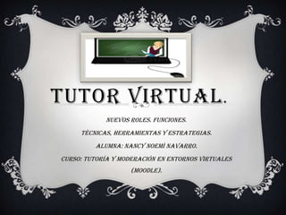 Este documento describe las funciones y responsabilidades de un tutor virtual, incluyendo organizar el curso, planear actividades, hacer seguimiento de la participación, responder inquietudes de los participantes, y motivar a los estudiantes. También cubre los requisitos para ser tutor virtual como formación en el área, manejo de herramientas tecnológicas, y experiencia trabajando en equipo. Finalmente, discute estrategias del tutor como establecer relaciones, fomentar participación, y diseñar evaluaciones.