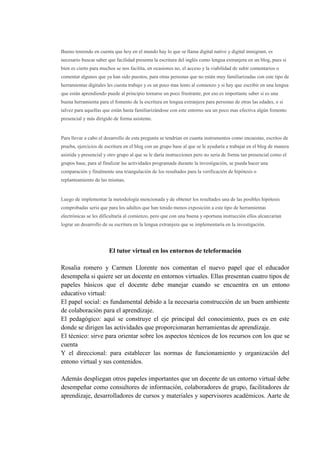El documento discute el papel del tutor en entornos de educación virtual. Explica que el tutor debe desempeñar roles social, pedagógico, técnico y de dirección. También debe desarrollar funciones como orientador, organizador y supervisor académico. El tutor requiere competencias pedagógicas, técnicas y de organización para guiar efectivamente a los estudiantes a través del curso virtual.