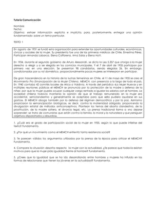 El documento presenta dos textos que describen la evolución de la participación de la mujer en la sociedad chilena. El primer texto detalla la fundación de organizaciones en la década de 1930 para promover los derechos de la mujer y el surgimiento del Movimiento Pro Emancipación de la Mujer Chilena, que abogaba por la igualdad de género. El segundo texto indica que en la actualidad la mujer desempeña un papel clave en la sociedad y ha logrado integrar roles laborales y familiares, y reconoce avances históricos como el