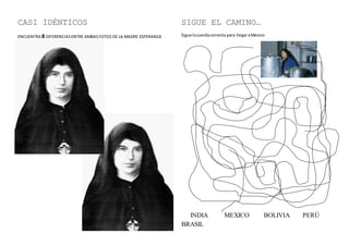 Este documento presenta dos actividades: un crucigrama y un juego de encontrar las diferencias entre dos fotos. El crucigrama contiene nombres de 9 países donde se encuentran obras de la Misericordia y pide encontrarlos en una sopa de letras. El segundo juego propone encontrar 8 diferencias entre dos fotos casi idénticas de la Madre Esperanza y da opciones para seguir un camino hacia México.