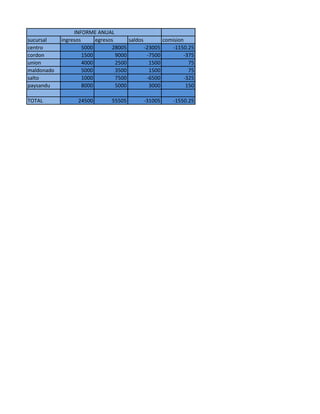 El documento presenta información financiera de 6 clientes con datos como importe de compra, fecha, número de cuotas, importe de cuota, porcentajes de interés e IVA. En total se registraron compras por $13,814 distribuidas en 20 cuotas para un total de cuotas de $6,234.83.