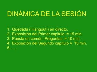 El documento presenta la dinámica de una sesión tutorial que incluye una quedada en directo, la exposición de dos capítulos con períodos de preguntas, y posiblemente la exposición de más capítulos. El tutor sigue las instrucciones de la jefatura de estudios y el Plan de Orientación y Acción Tutorial del centro para cumplir con sus funciones.