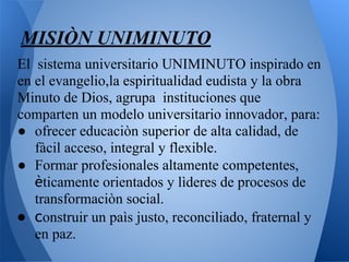 El documento proporciona información sobre la misión, visión y modalidades de formación de la Universidad Minuto de Dios (UNIMINUTO). Su misión es ofrecer educación superior de alta calidad, accesible y flexible para formar profesionales éticos que contribuyan a construir un país justo y en paz. Su visión es ser reconocida por la espiritualidad, calidad académica, cobertura e impacto social, y relaciones internacionales. Ofrece educación presencial, a distancia y semipresencial, y se