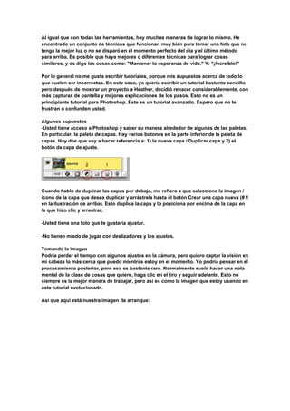 El documento proporciona instrucciones detalladas para editar una fotografía en Photoshop en 3 pasos: 1) Aplicar máscaras de enfoque y desenfoque para mejorar la nitidez y el contraste, 2) Usar máscaras de capa para resaltar elementos clave y 3) Añadir capas de ajuste como selección de color, niveles y curvas para mejorar el color y la luminosidad. El objetivo es transformar una foto plana en una imagen más dramática y atractiva visualmente.
