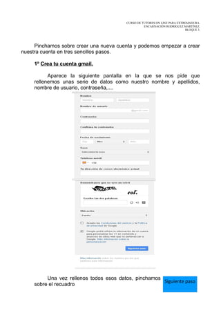 Este documento proporciona instrucciones para crear una cuenta de correo electrónico en Gmail. Explica que primero debes ingresar a www.gmail.com y hacer clic en "Crear una nueva cuenta", luego completar un formulario con tu nombre, nombre de usuario y contraseña. Después puedes añadir una foto de perfil y confirmar tu dirección de correo electrónico. Finalmente, podrás acceder a tu nueva cuenta de Gmail ingresando con tu nombre de usuario y contraseña.
