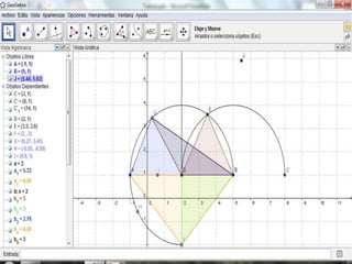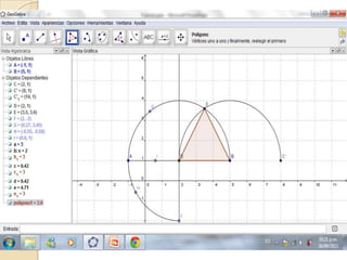Este documento presenta un tutorial sobre cómo usar el software educativo GeoGebra para enseñar matemáticas de manera dinámica y divertida. Explica cómo instalar GeoGebra, sus principales menús y herramientas, y ofrece ejemplos de cómo crear figuras geométricas como polígonos regulares, histogramas y triángulos dinámicos. Resalta que GeoGebra permite explorar y experimentar con matemáticas de forma creativa.
