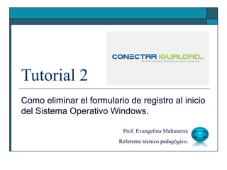 Este documento proporciona instrucciones en 3 pasos para eliminar el formulario de registro que aparece al iniciar el Sistema Operativo Windows. Primero, debe registrar la netbook en el portal Conectar Igualdad para habilitar la garantía. Luego, debe abrir el programa msconfig y desactivar la casilla "Formulario" en la pestaña de Inicio de Windows. Finalmente, debe reiniciar la netbook para que el cambio elimine el formulario de registro al inicio.