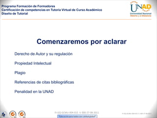 Este documento explica las políticas de plagio de la UNAD. Comienza definiendo el derecho de autor y cómo está regulado en Colombia. Luego define la propiedad intelectual y el plagio, indicando que este último ocurre cuando se toman ideas de otros autores sin darles crédito. Explica cómo citar correctamente y la importancia de incluir una bibliografía. Por último, detalla las penalidades que aplica la UNAD a los estudiantes que cometen plagio en sus trabajos.