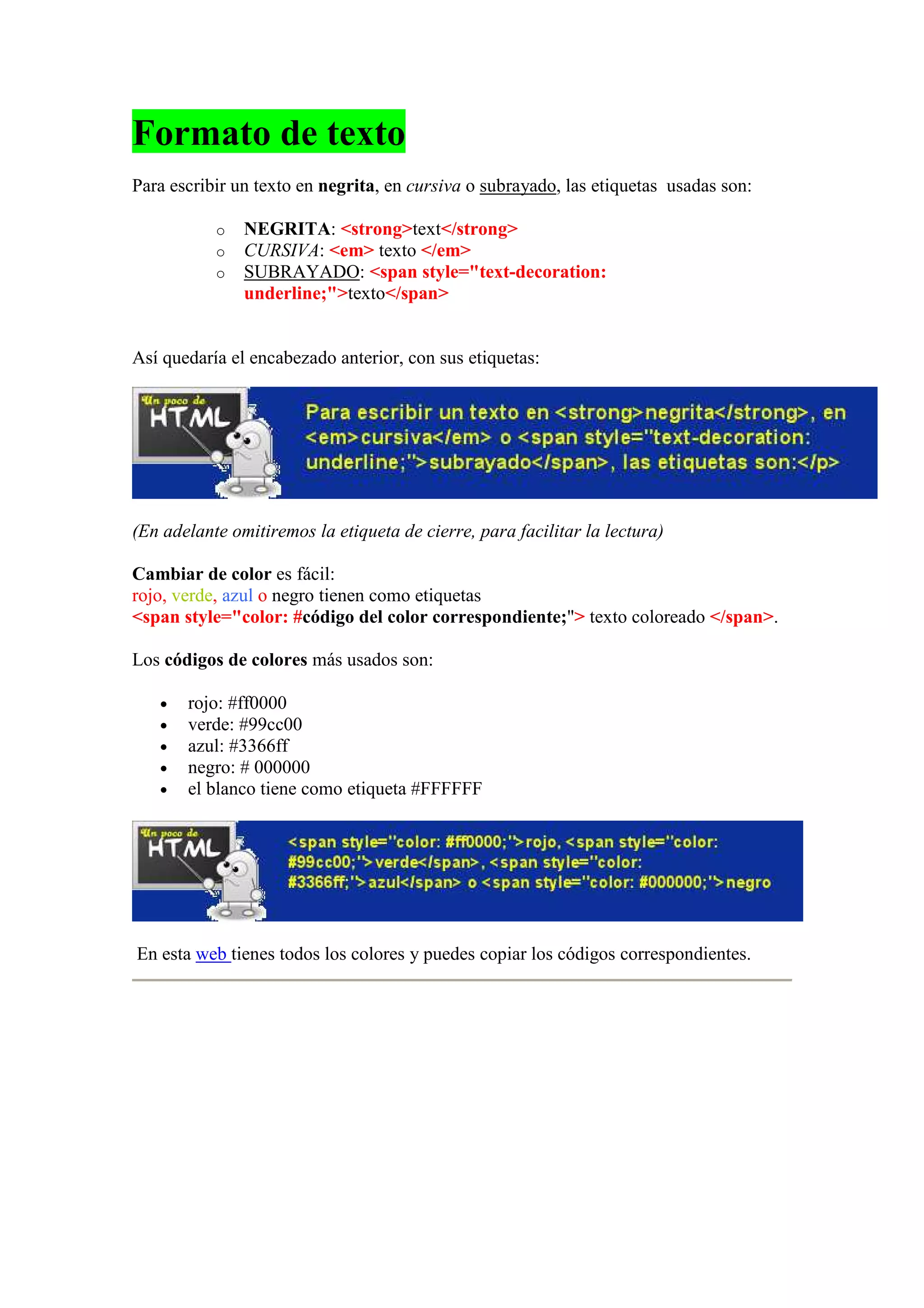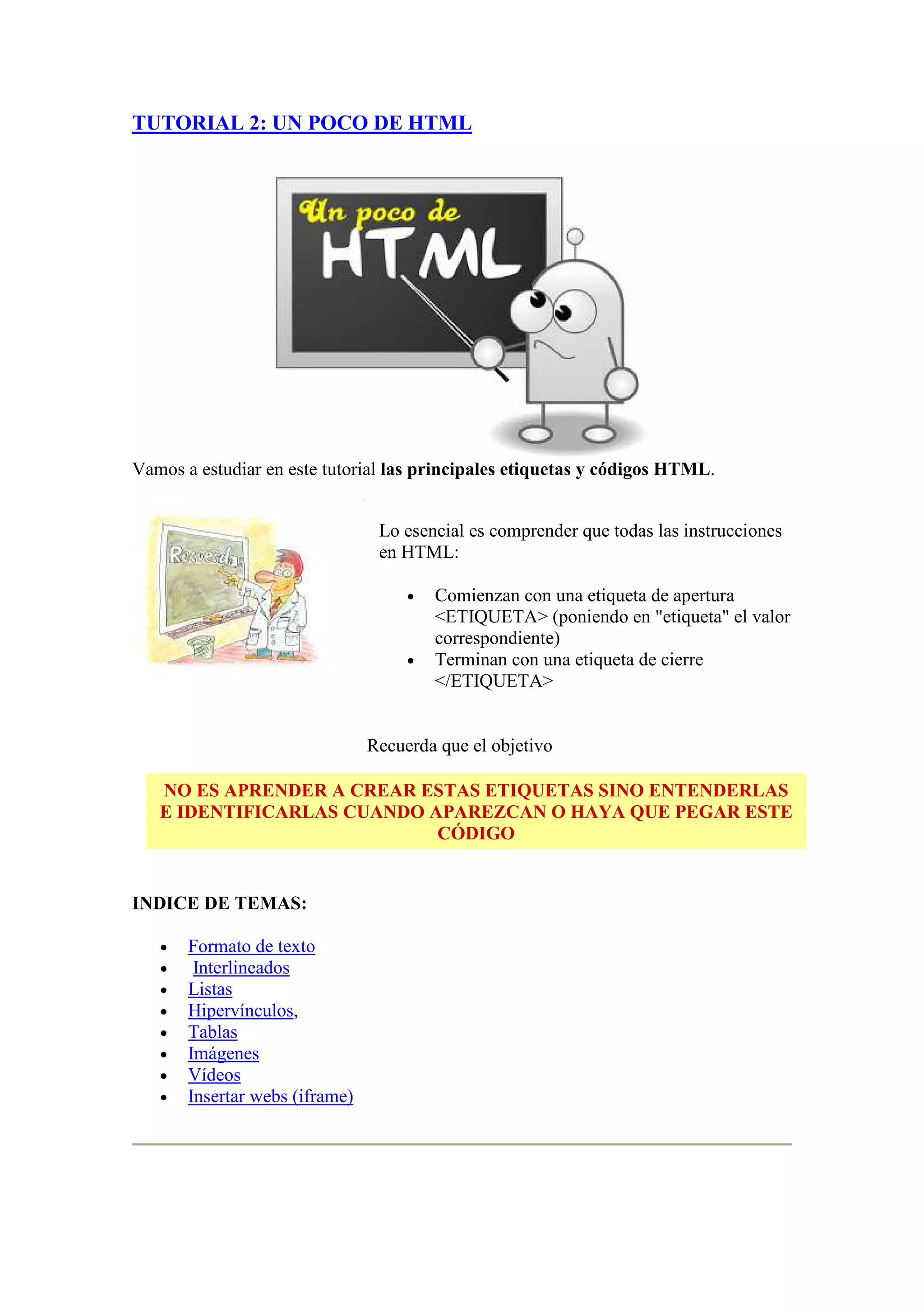 Este documento proporciona una introducción a las principales etiquetas y códigos HTML. Explica cómo formatar texto, agregar listas, hipervínculos, tablas, imágenes, videos e iframes. El objetivo no es aprender a crear estas etiquetas sino entenderlas e identificarlas cuando aparezcan en código HTML.