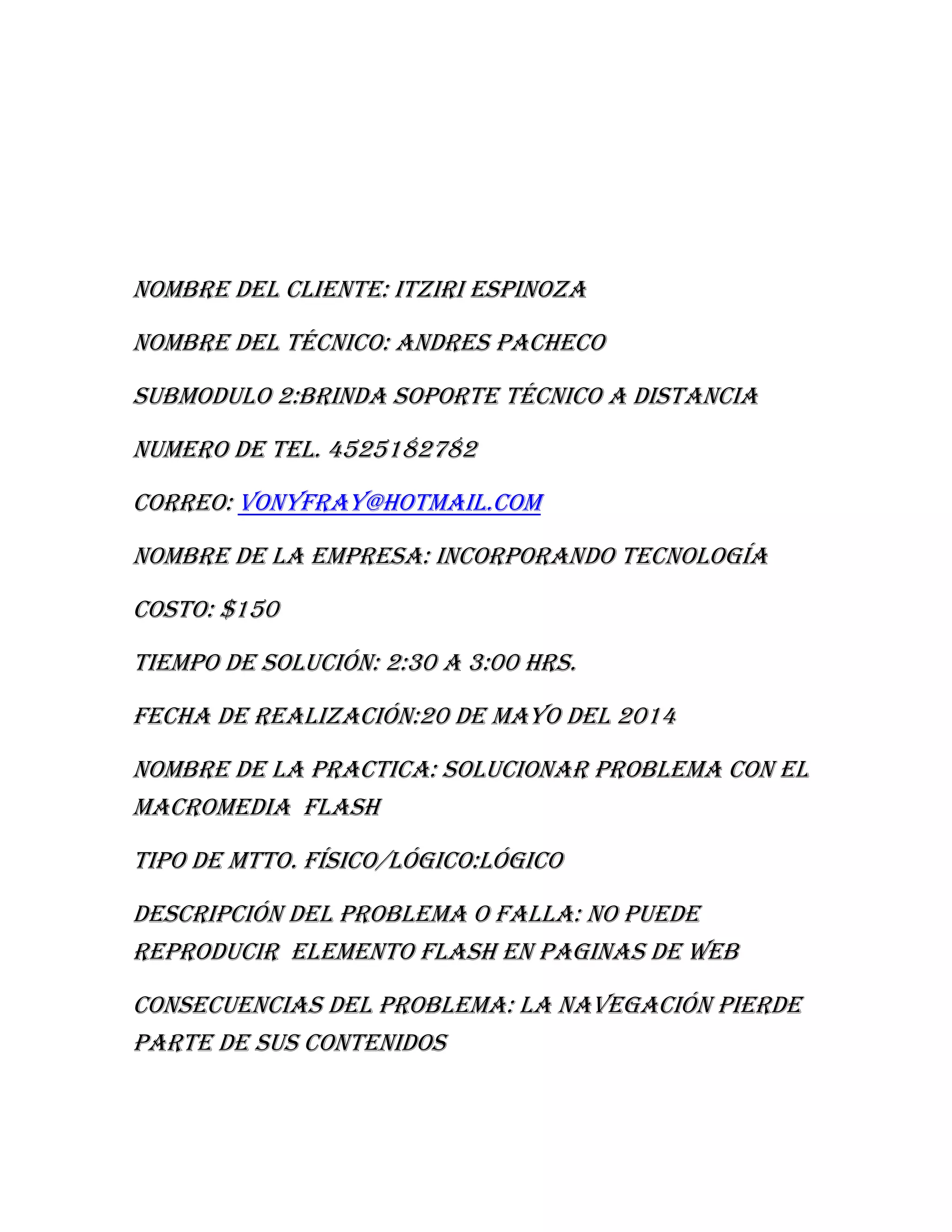 Este documento describe una sesión de soporte técnico remoto para resolver un problema con Macromedia Flash. El técnico Andrés Pacheco asistió a Itziri Espinoza de la empresa Incorporando Tecnología para instalar el controlador Flash actualizado en 2.5-3 horas a un costo de $150. El problema era que las páginas web no podían reproducir elementos Flash, pero después de seguir los pasos para descargar e instalar Flash, el problema se resolvió satisfactoriamente.