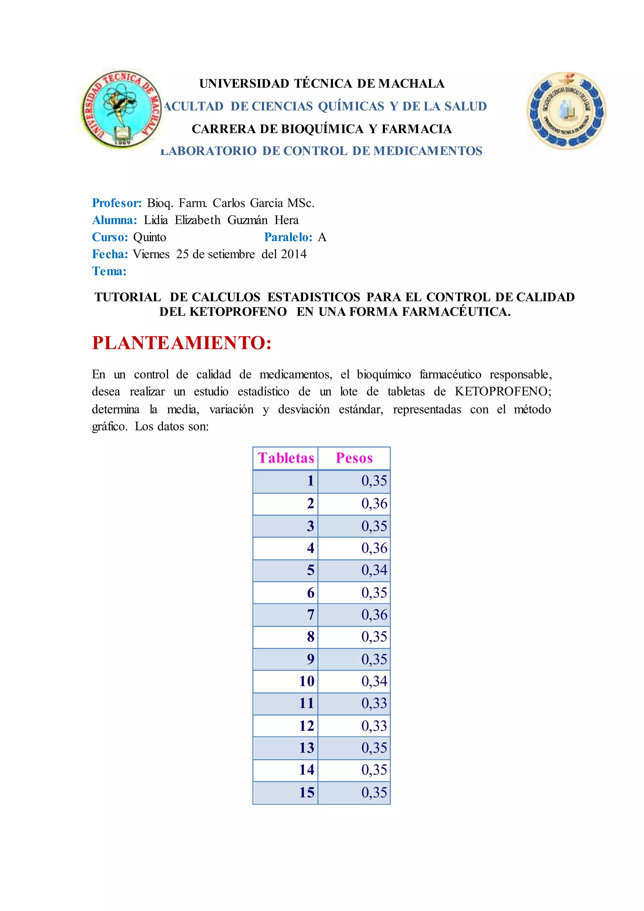 Este documento presenta un análisis estadístico de los pesos de 15 tabletas de ketoprofeno para determinar la media, varianza y desviación estándar utilizando métodos directos con fórmulas y manualmente. Se calculan estos valores y se grafica el resultado con líneas para la media, límite inferior y superior.