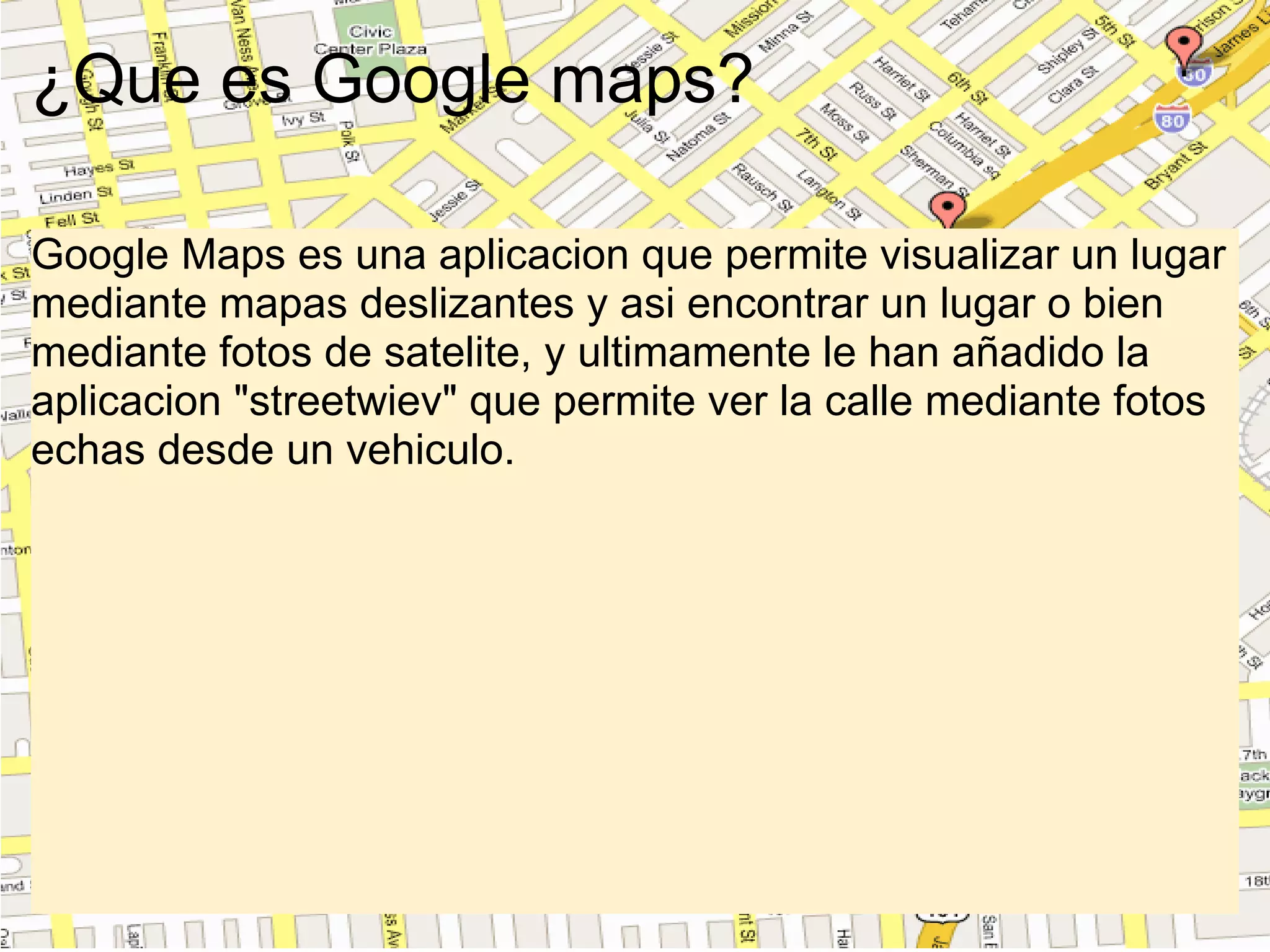 Google Maps es una aplicación que permite visualizar lugares mediante mapas interactivos o fotos de satélite, y recientemente añadió Street View que muestra fotos tomadas desde un vehículo. Se puede acceder a Google Maps en maps.google.es e ingresar una dirección o explorar el mapa manualmente. Además de estas funciones básicas, ofrece imágenes satelitales, búsqueda de negocios y la opción de ver el mapa y satélite simultáneamente.