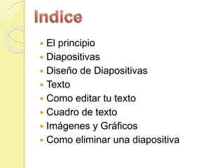 El documento proporciona instrucciones sobre cómo crear y editar una presentación en PowerPoint. Explica cómo agregar nuevas diapositivas, cambiar el diseño y fondo, insertar texto, imágenes y gráficos, y eliminar diapositivas. Detalla dónde encontrar las diferentes herramientas en las pestañas de PowerPoint para realizar estas tareas.