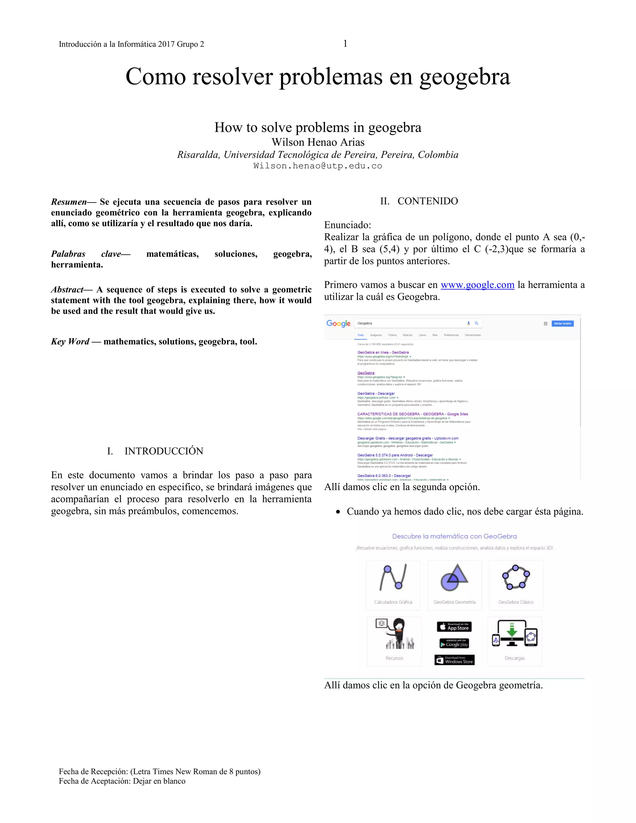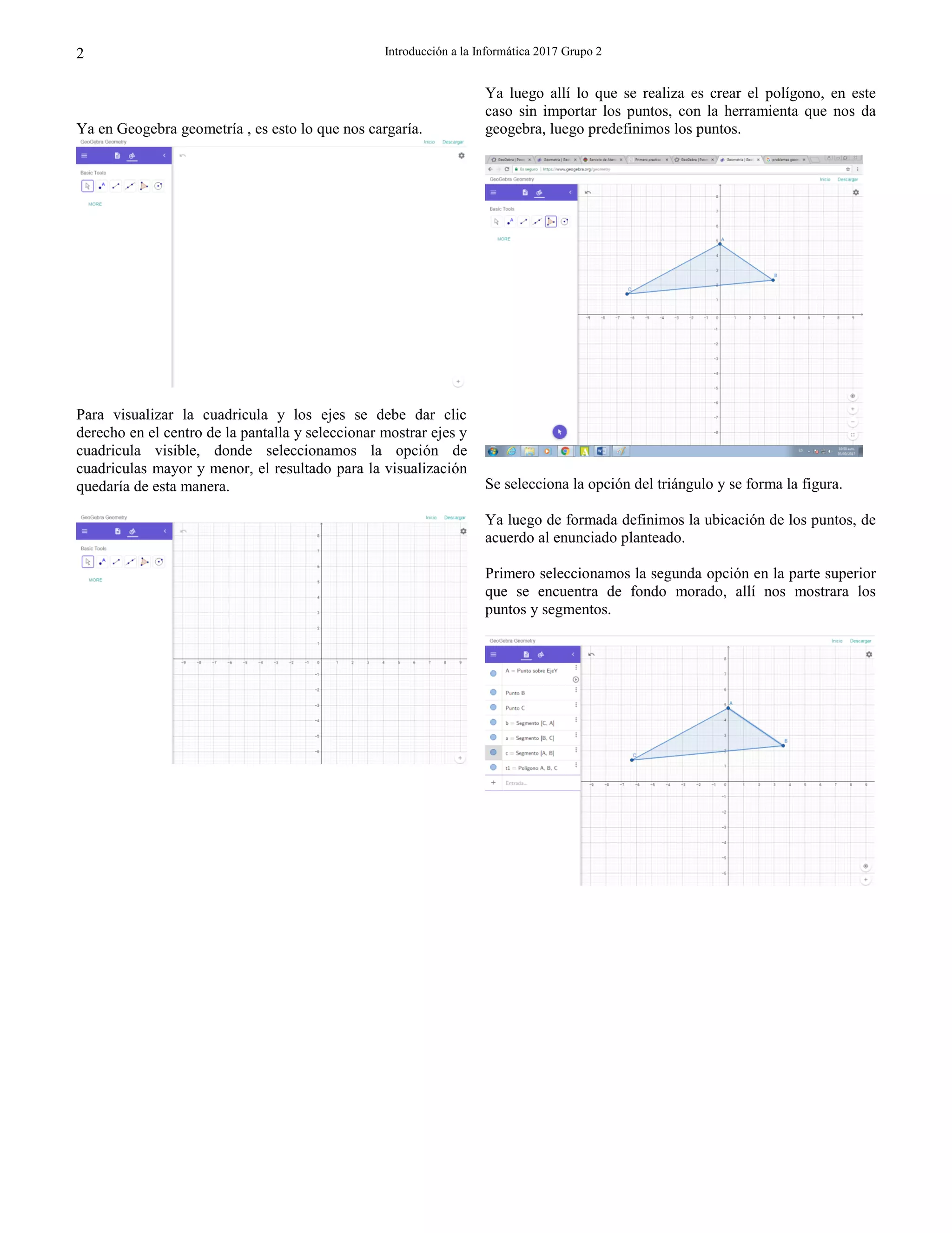 Este documento describe los pasos para resolver un problema geométrico utilizando la herramienta Geogebra. Explica cómo crear un polígono a partir de tres puntos dados (A = (0,-4), B = (5,4), C = (-2,3)) usando las funciones de Geogebra. Primero se abre Geogebra, luego se crea el polígono y se definen los puntos según las coordenadas dadas. Finalmente, se muestra la figura resultante.