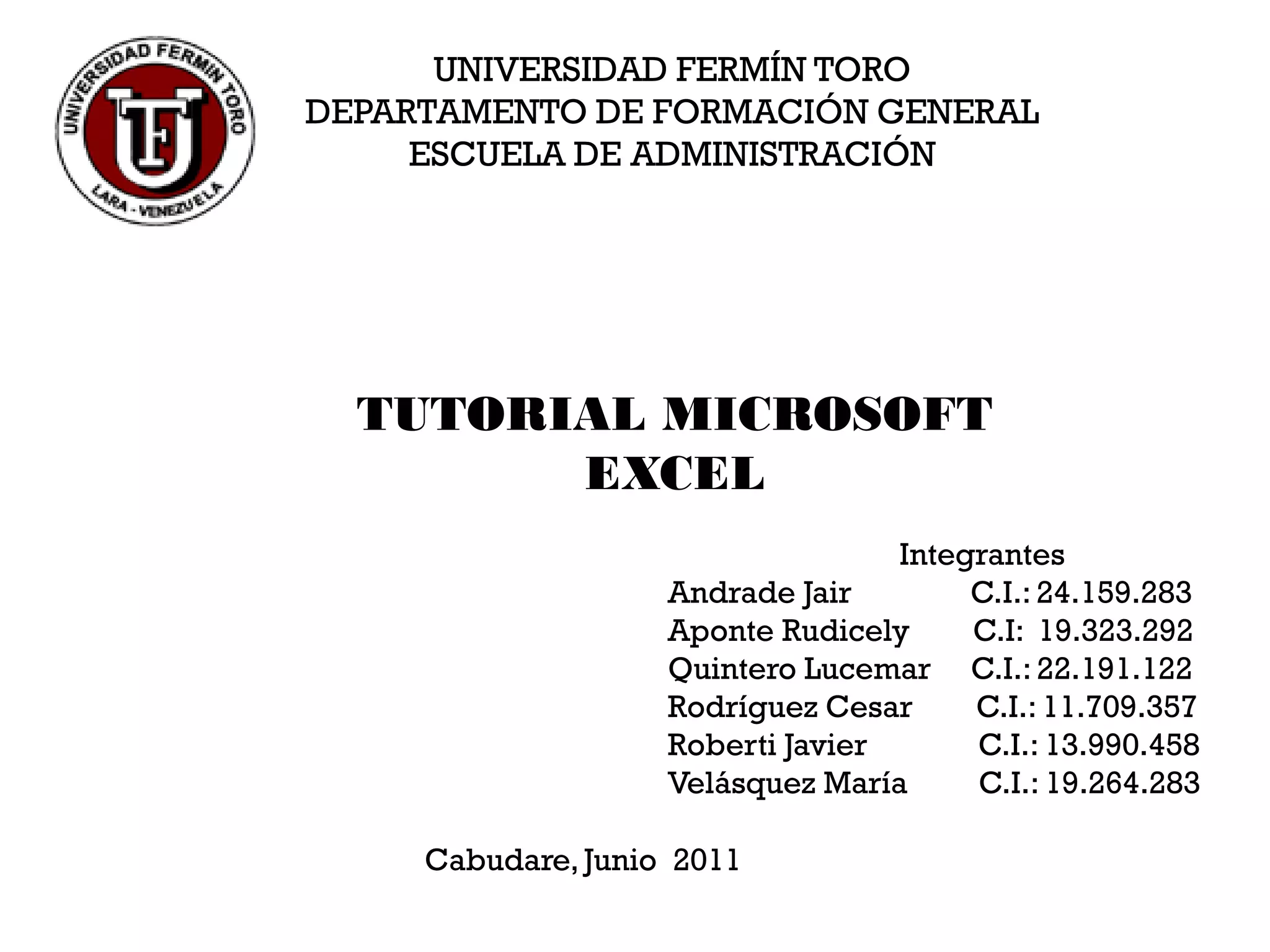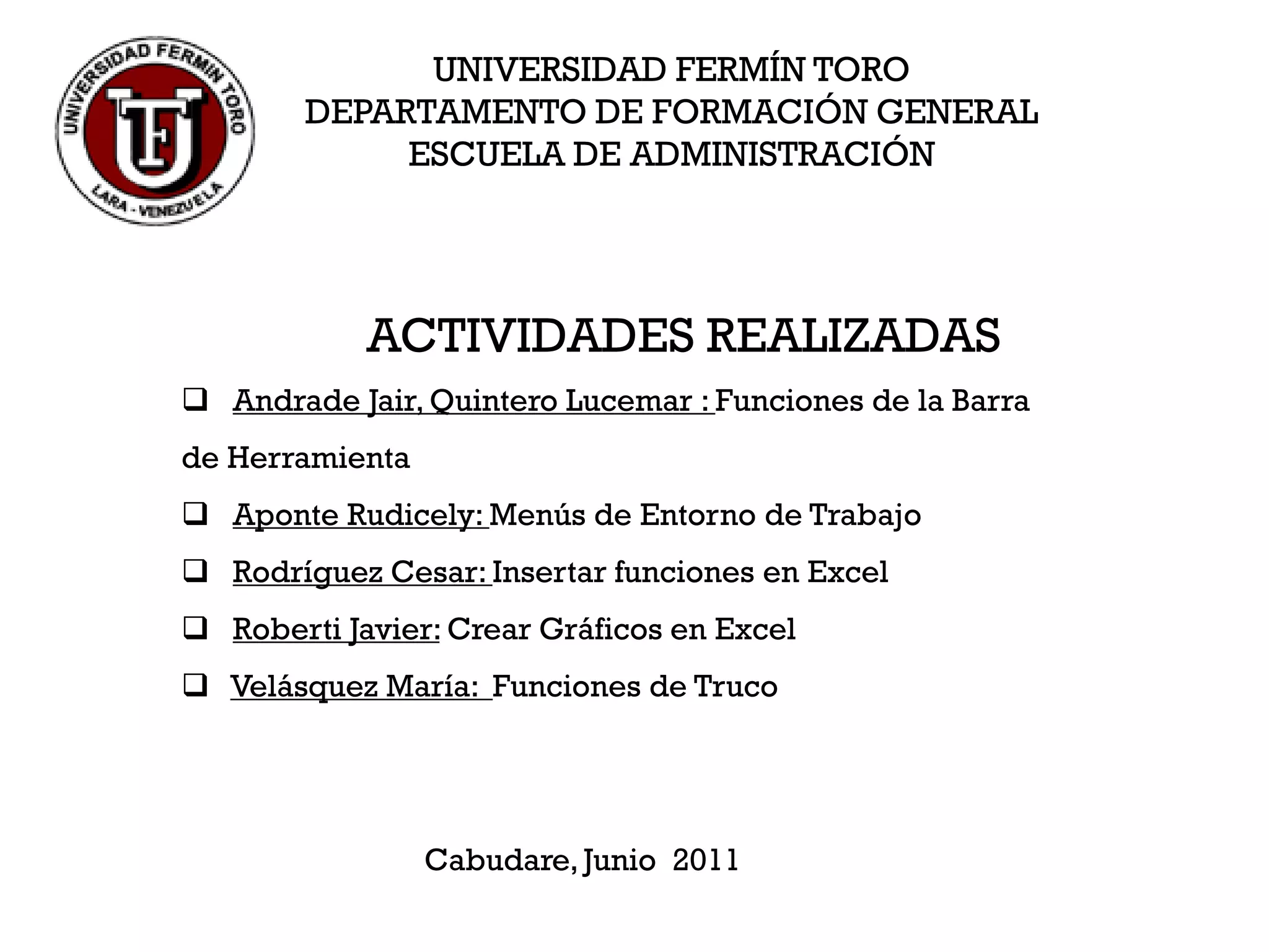 Este documento presenta un tutorial de Microsoft Excel realizado por estudiantes de la Universidad Fermín Toro. Se resumen las actividades realizadas por cada estudiante sobre diferentes temas del programa como funciones, gráficos e inserción de funciones. También se explican conceptos como la barra de herramientas, menús, funciones y trucos de Excel.