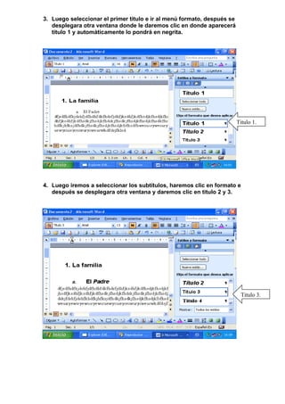 Este documento presenta varios tutoriales sobre funciones en Microsoft Word. Incluye tutoriales sobre cómo crear subtítulos y títulos, índices, referencias, numeración y formato condicional. Explica los pasos para aplicar estos formatos y funciones como ir al menú correspondiente, seleccionar el texto, y aplicar el formato deseado.