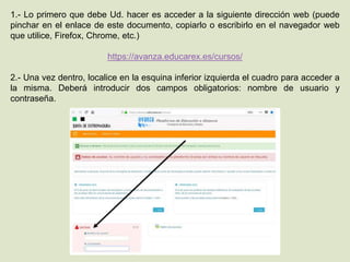 El documento proporciona instrucciones para acceder a la plataforma de educación a distancia de la consejería de educación y empleo. Los usuarios deben ingresar su nombre de usuario y contraseña, utilizando credenciales de la plataforma Rayuela o su DNI en caso de no tener acceso. También se detalla cómo solucionar problemas de acceso y navegar por los cursos disponibles una vez dentro de la plataforma.