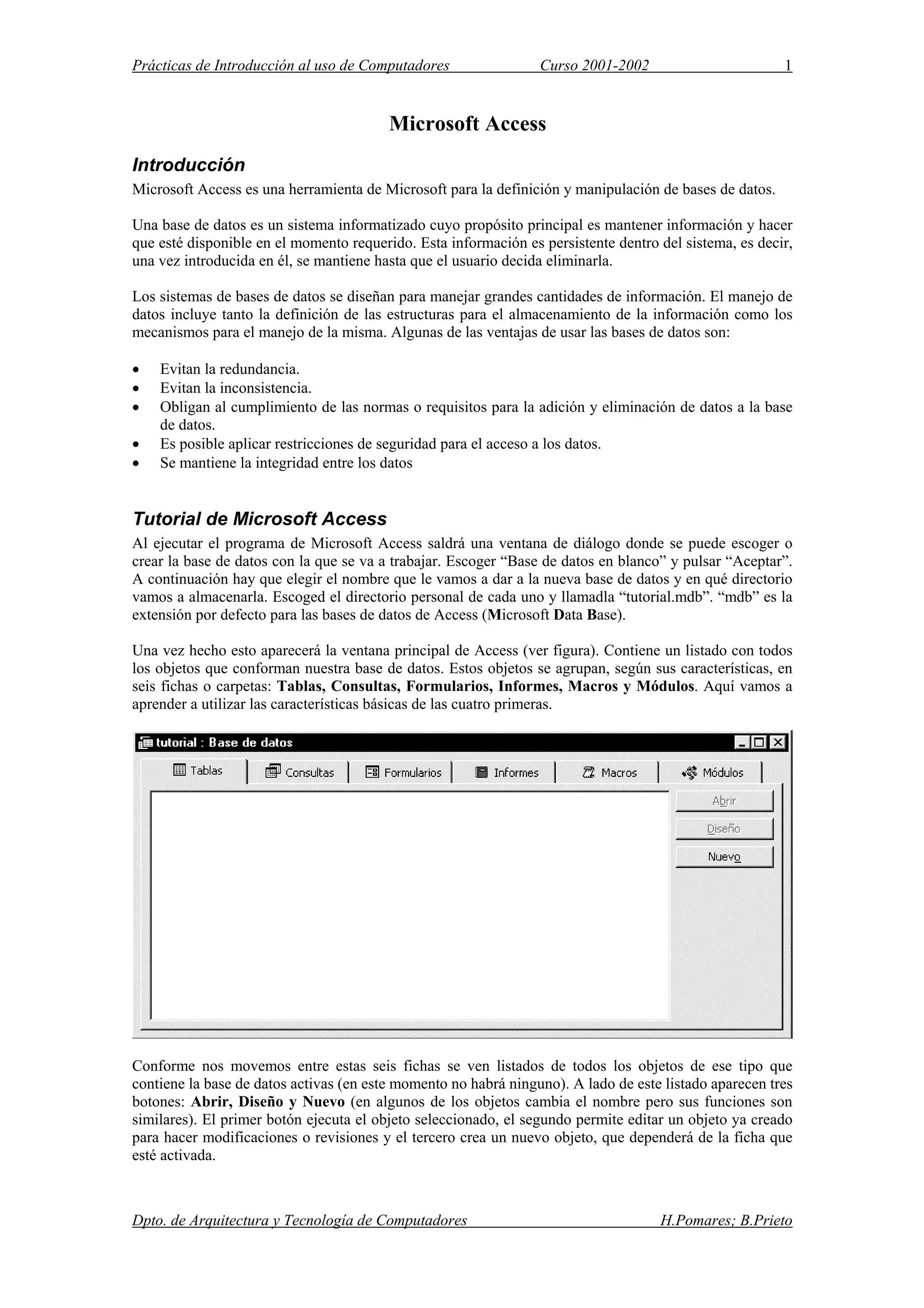Microsoft Access es una herramienta para crear y manipular bases de datos. El documento describe cómo crear una base de datos sencilla sobre discos musicales con tablas, formularios, consultas e informes. Se explica cómo definir campos y tipos de datos, introducir registros, y generar automáticamente formularios, consultas para filtrar y calcular datos, e informes para presentar la información.
