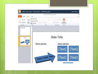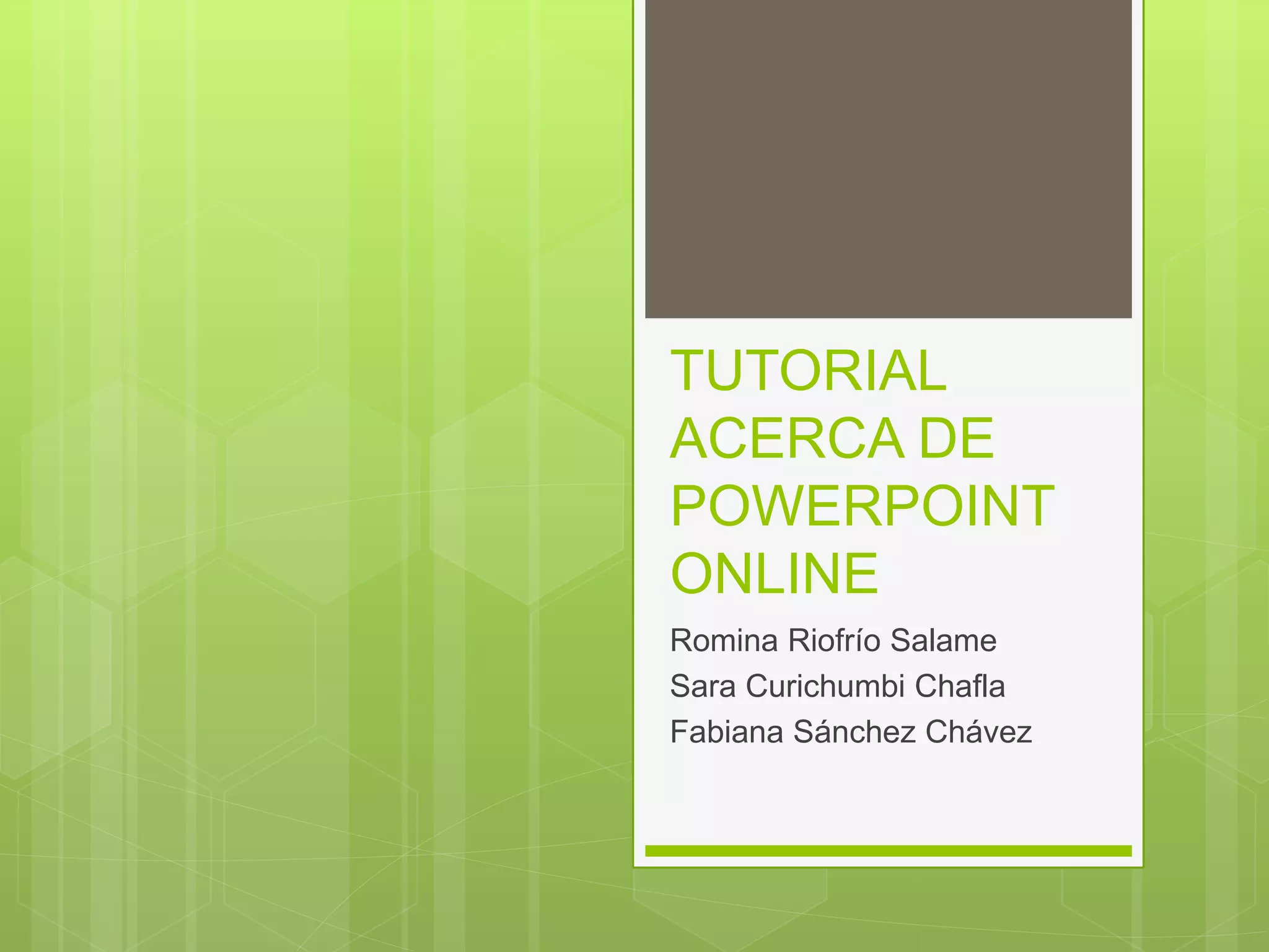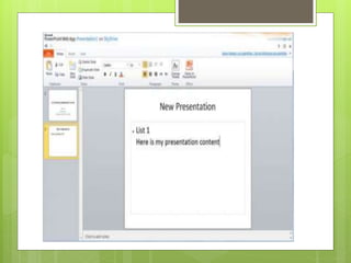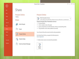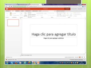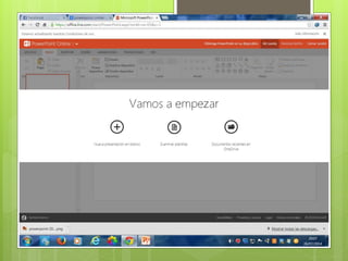 Este documento proporciona una introducción a PowerPoint Online. Explica que PowerPoint permite crear presentaciones visuales con texto, imágenes y gráficos para proyectarlas. Se utiliza PowerPoint para anunciar informes o propuestas. El documento también describe cómo crear, guardar y compartir presentaciones en línea utilizando OneDrive de Microsoft.