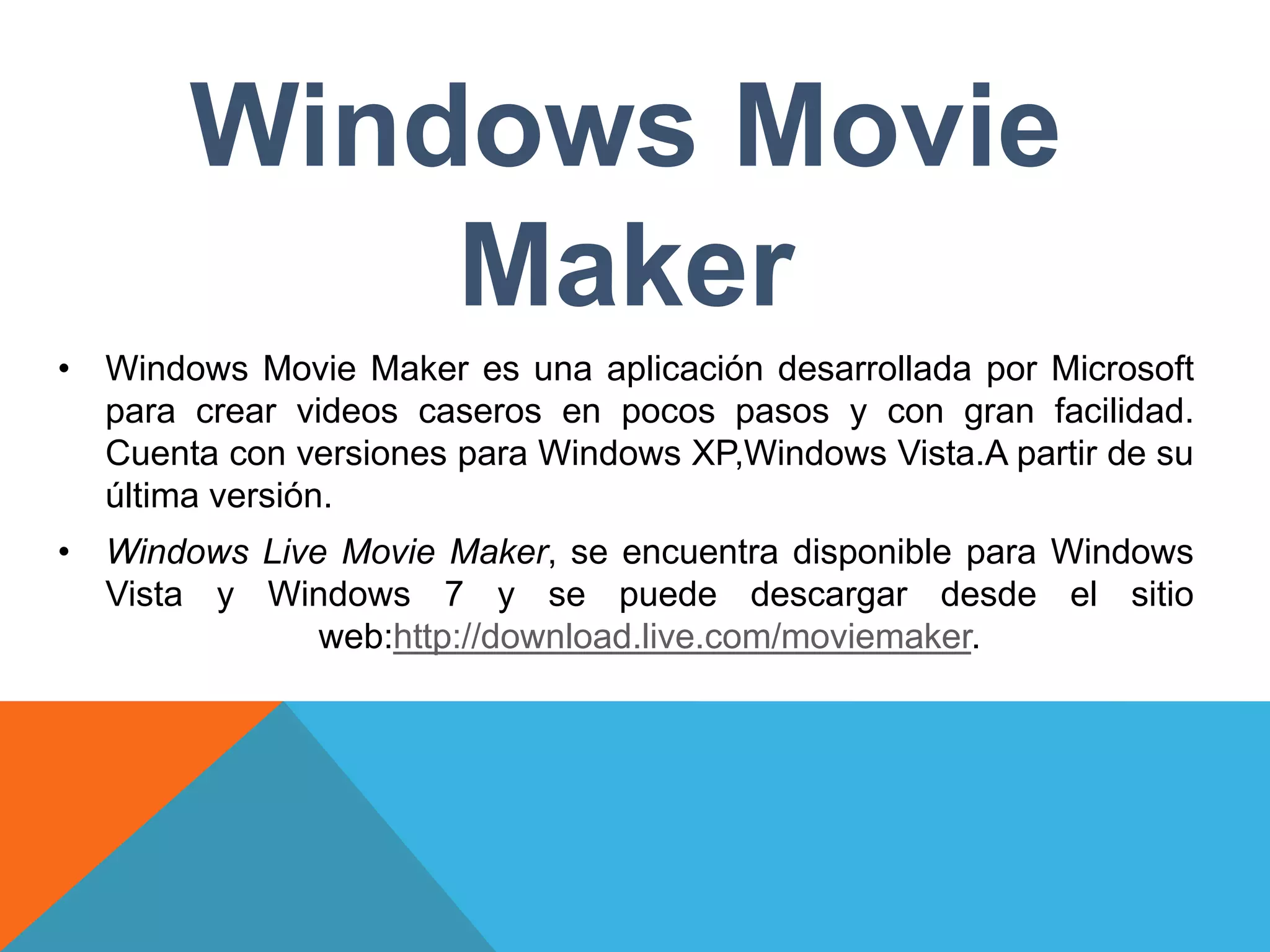 Este documento proporciona instrucciones para usar el programa Windows Movie Maker para crear videos caseros de manera fácil. Explica cómo descargar, instalar y ubicar el programa, luego importar videos, fotos y audio, aplicar transiciones y efectos, editar parámetros y generar un video final.