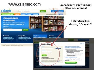 El documento proporciona instrucciones en 3 pasos para crear y subir una nueva publicación en la plataforma Calameo: 1) Acceder a la cuenta, 2) Hacer clic en "Crear una nueva publicación" para subir un archivo desde el ordenador y rellenar los datos sobre el documento, 3) Hacer clic en "Iniciar carga" para completar la subida.