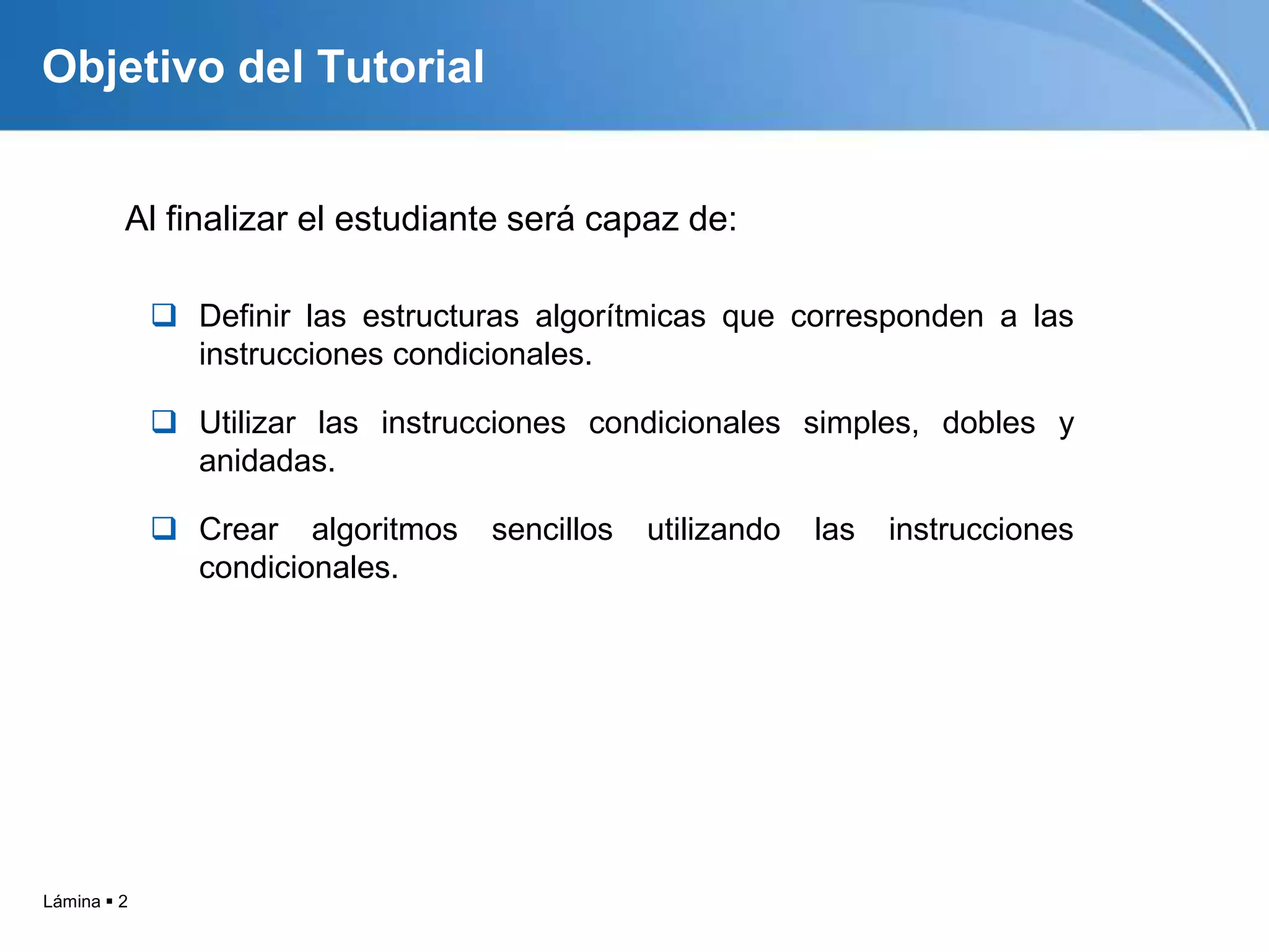 Este documento presenta un tutorial sobre instrucciones condicionales. Explica las diferentes estructuras condicionales como selección simple, doble y anidada. Incluye definiciones, representaciones en pseudocódigo y diagramas de flujo. También contiene ejemplos para ilustrar cada tipo de instrucción condicional. El objetivo del tutorial es que los estudiantes aprendan a definir y utilizar las instrucciones condicionales para crear algoritmos.