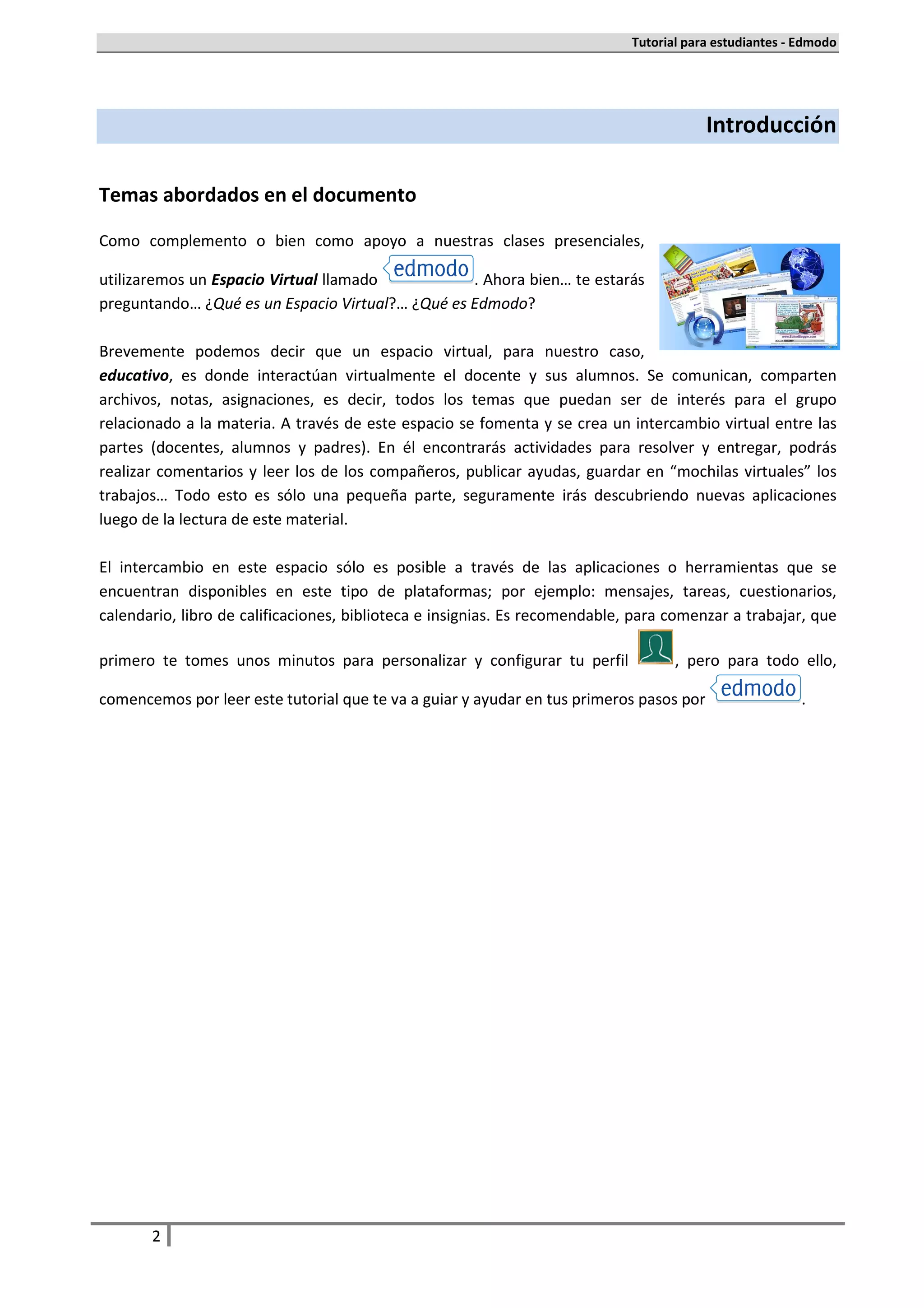 El documento presenta un tutorial para que estudiantes aprendan a usar la plataforma Edmodo. Explica cómo registrarse como alumno, actualizar el perfil personal, y navegar las secciones principales como el Muro, Biblioteca, Calendario, entre otras. El objetivo es guiar a los estudiantes en sus primeros pasos usando Edmodo para la educación virtual.