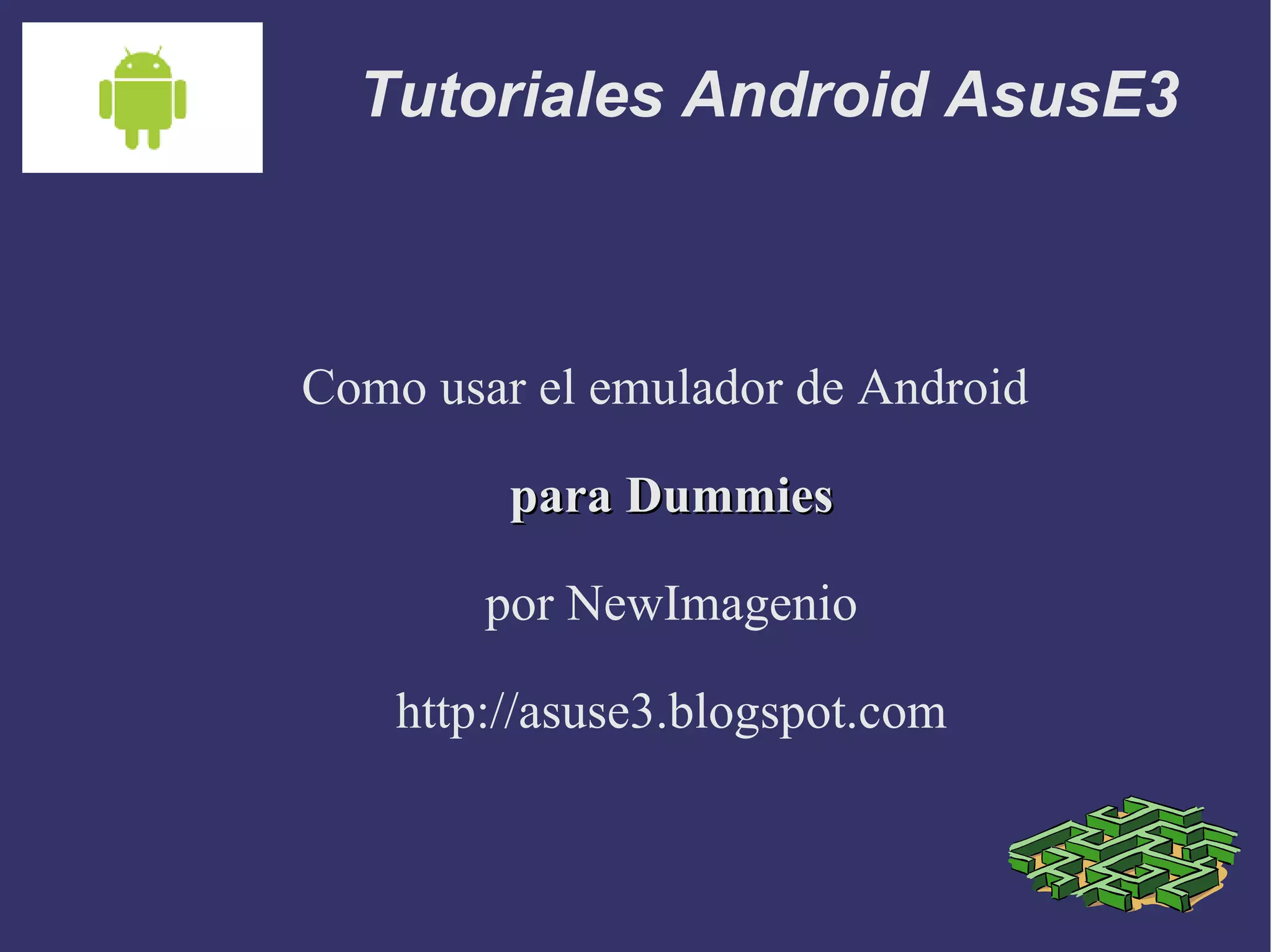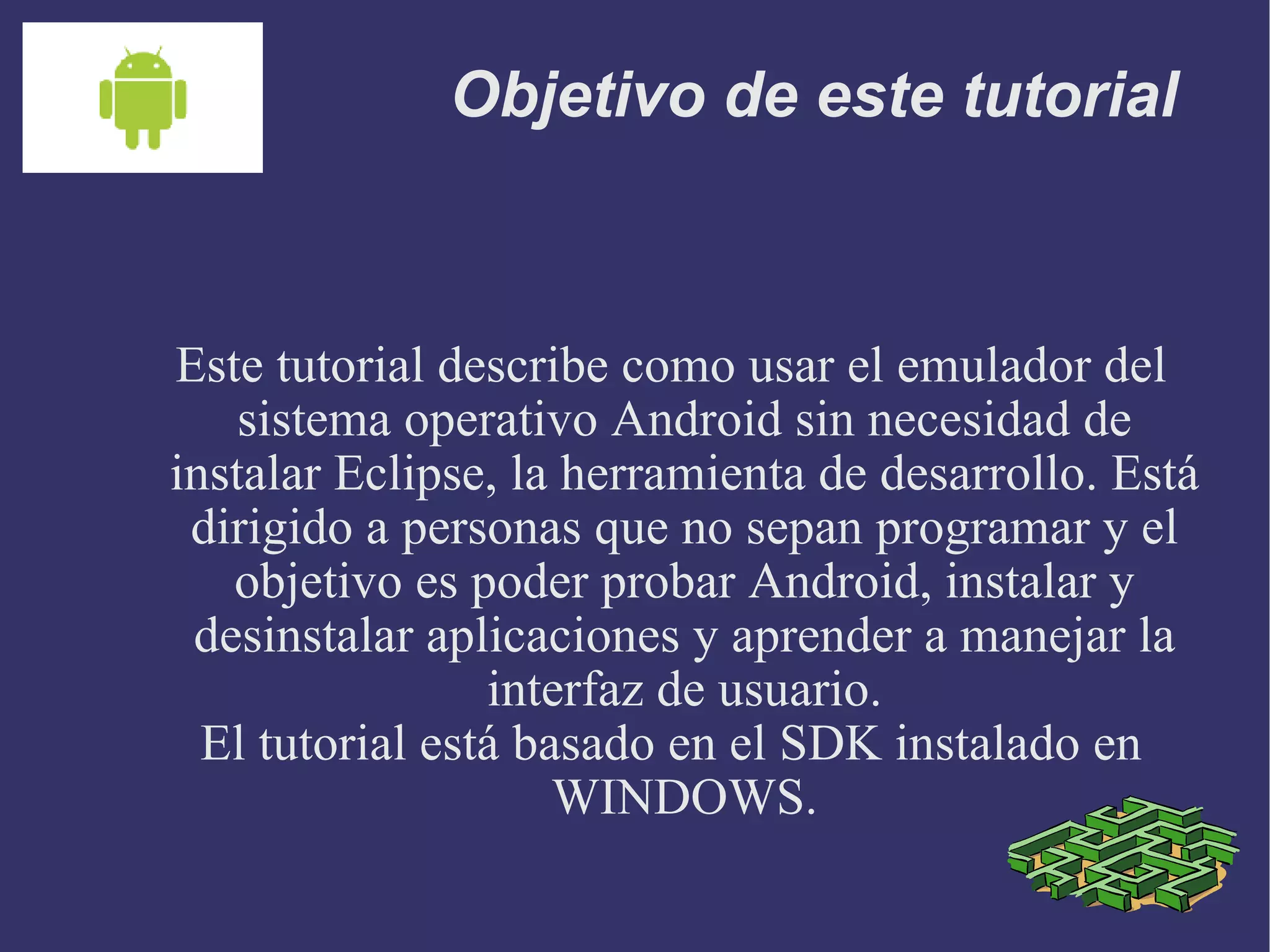Este documento proporciona instrucciones para usar el emulador de Android sin necesidad de instalar Eclipse. Explica cómo descargar e instalar el SDK de Android, lanzar el emulador, acceder a aplicaciones como Maps y el navegador, e instalar y desinstalar aplicaciones en el emulador usando comandos de línea.